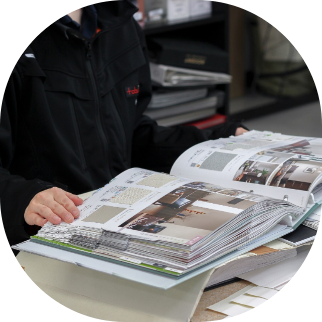 デザインは、専門業者からデザインを買い取って制作するケースと、クライアントの原稿をもとにこちらで一から制作するケースがあります。デザインを買い取る場合は、サンプルが集められた「見本帳」の中から使えそうなデザインを選んでいきます。本当にいろいろなデザインがあるので、眺めているだけでもワクワクします。