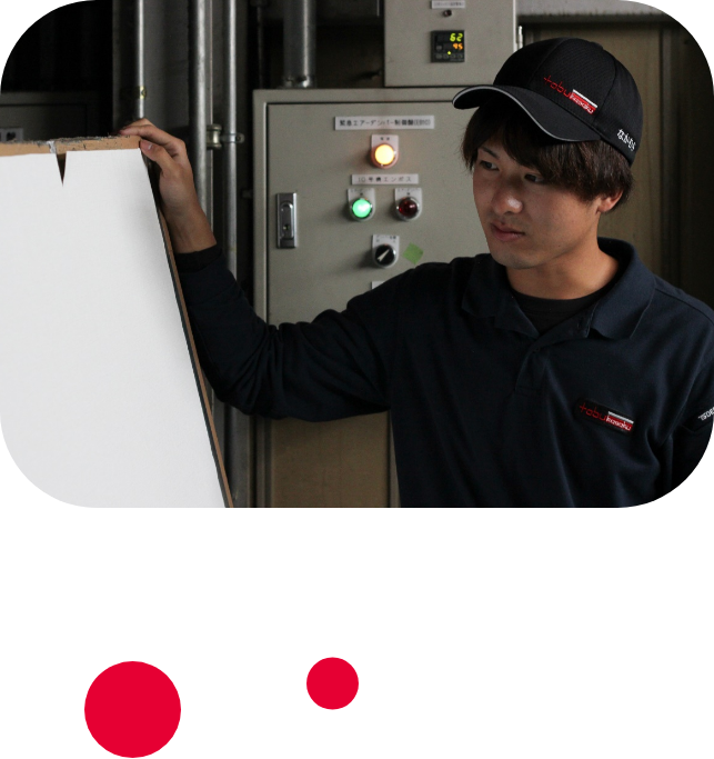同時に、流れている壁紙を1メートルほど切り取り、検査室のボードに貼って色やツヤ、質感のチェックを行います。光の当たり方で印象がかなり変わるので、電気をつけたり、消したり、さまざまな角度から、さまざまな光のもとで見え方を確認します。OKかどうかの見極めにははっきりとした数字がないので、先輩のやり方を見習いながら、とにかく自分の目を養っていくしかありません。最初の頃は見方がまったくわかりませんでしたが、ポイントを教えてもらいながら少しずつ覚えていきました。